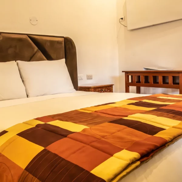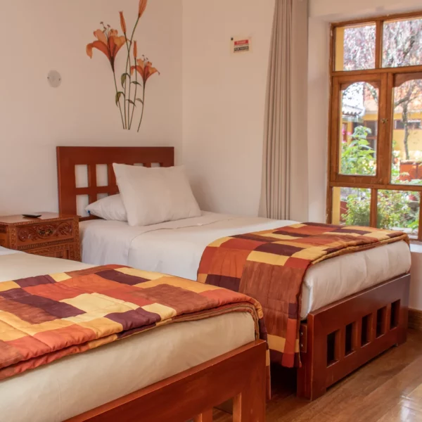 Cuenta con dos camas tipo twin o 01 cama tamaño queen, baño privado, toalla de cuerpo, mano, papel higiénico, jabón y champú. TV con cable en la habitación. Panel de calefacción de encendido automático en las noches. El servicio incluye limpieza diaria y desayuno en el comedor.